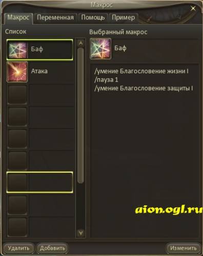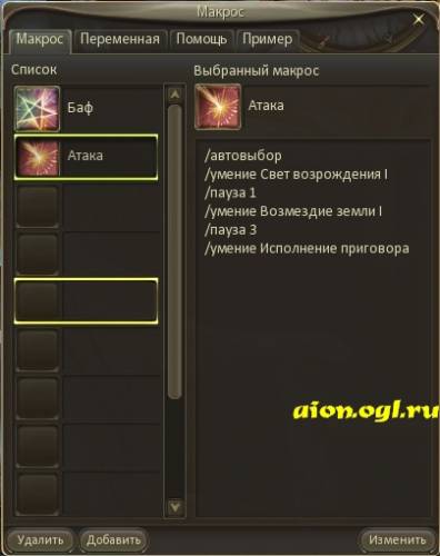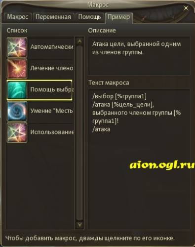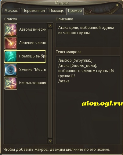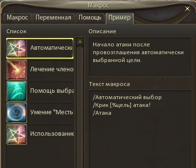 Макросы в Айон похожи и отличны от того, что нам предоставляется в прочих играх. Для начала, команда-локализатор перевела в том числе команды и операторы, так что мы фактически просто пишем текст о том, что хотим сделать. К тому же в окно макросов встроен ряд готовых примеров, которыми можно пользоваться как шаблонами, так и руководством к действию.